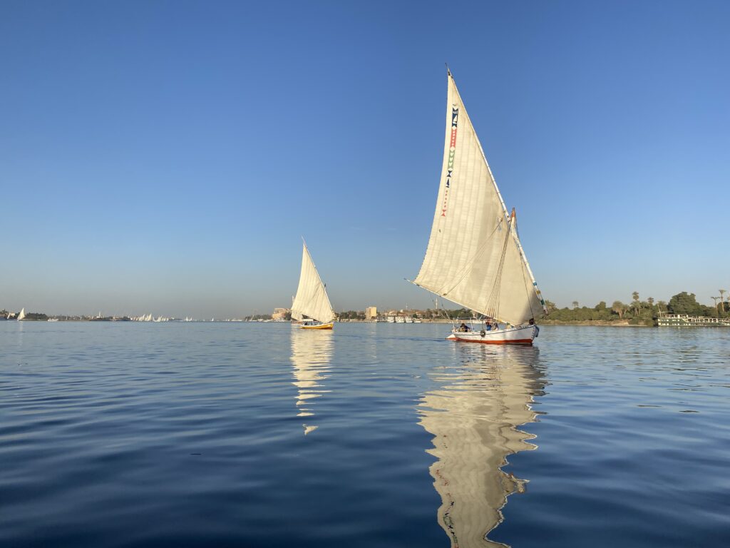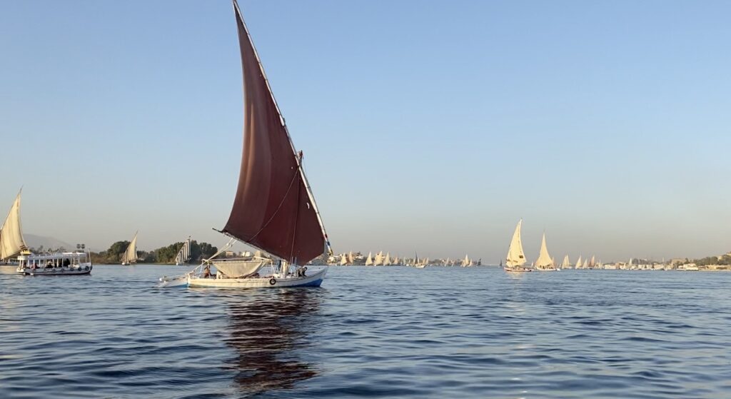 Aan het eind van de middag is de Nijl, die op deze plek zo’n 800 meter breed is, goed gevuld met felucca’s. Een bekend beeld op dit tijdstip, omdat veel toeristen de zonsondergang graag vanaf het water willen beleven.